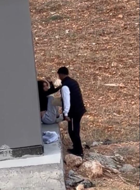 Tartışmanın büyümesi üzerine erkek, kadının saçını çekip tartakladı. Ardından kadını yere yatırarak elindeki çantayla başına vurdu. Kadının zaman zaman tokat atarak karşılık verdiği, ardından ikilinin sohbet etmeye devam ettiği anlar çevredeki bir kişi tarafından cep telefonuyla kaydedildi.